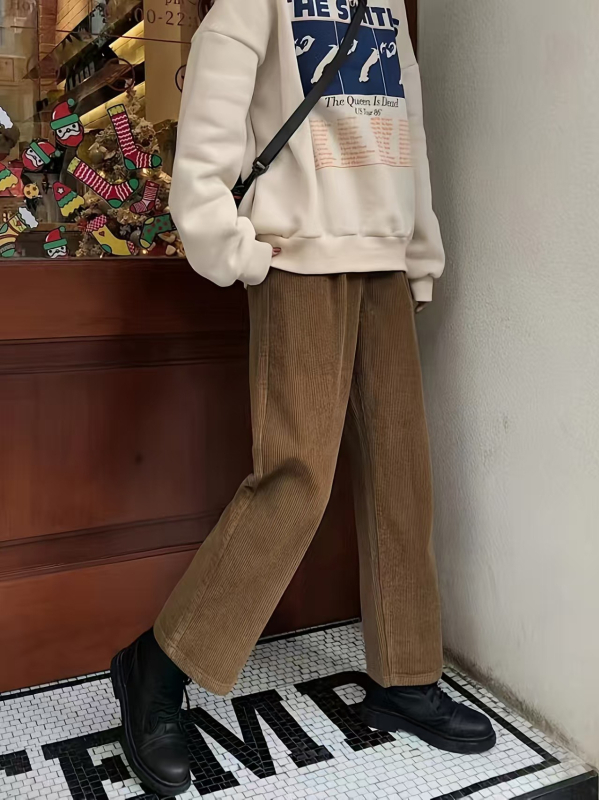 Γυναικείοι παντελόνες Corduroy – Υψηλή μέση, ευθεία γραμμή, χαλαρό ρετρό στυλ, Μεσαία ελαστικότητα