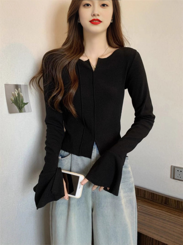 Γυναικείο πλεκτό τοπ με καμπάνες μανίκια, V-ντεκολτέ, στενή γραμμή, κανονική μήκος, πολυεστέρας