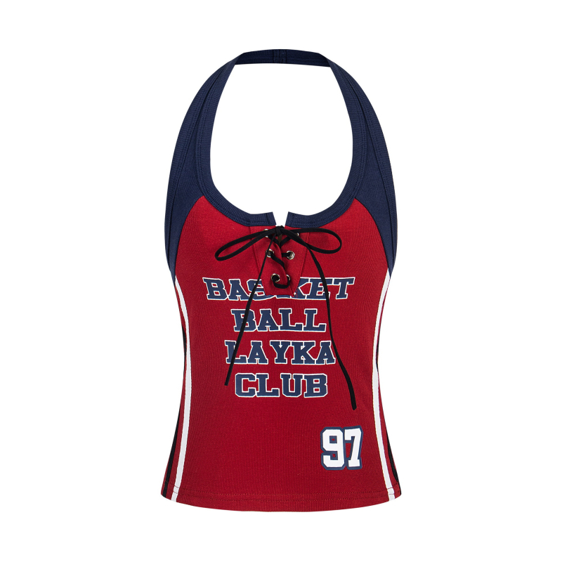 Γυναικείο τοπ με λαιμό halter από βαμβάκι, εφαρμοστό, με σχέδιο κειμένου, καλοκαίρι 2025