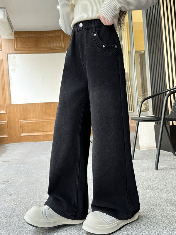 Κοριτσίστικα τζίν από ντένιμ με επένδυση φλίς, φθινοπωρινά–χειμερινά, μεσαία μέση, ίσιο και φαρδύ παντελόνι, 90% πολυεστέρας, για παιδιά άνω των 8 ετών