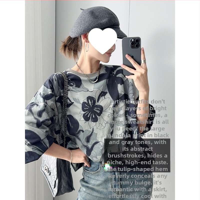 Φούτερ με μοτίβο φυτών και λουλουδιών, με κουκούλα, ώμοι με πτώση, φαρδιά γραμμή, στρογγυλός λαιμός