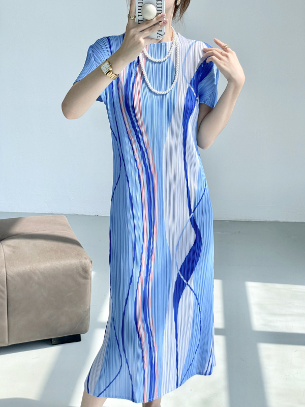 Φόρεμα από πολυεστέρα με ριγέ εκτύπωση, κοντά μανίκια, στρογγυλή λαιμόκοψη, μεσαίου μήκους, ενός κομματιού