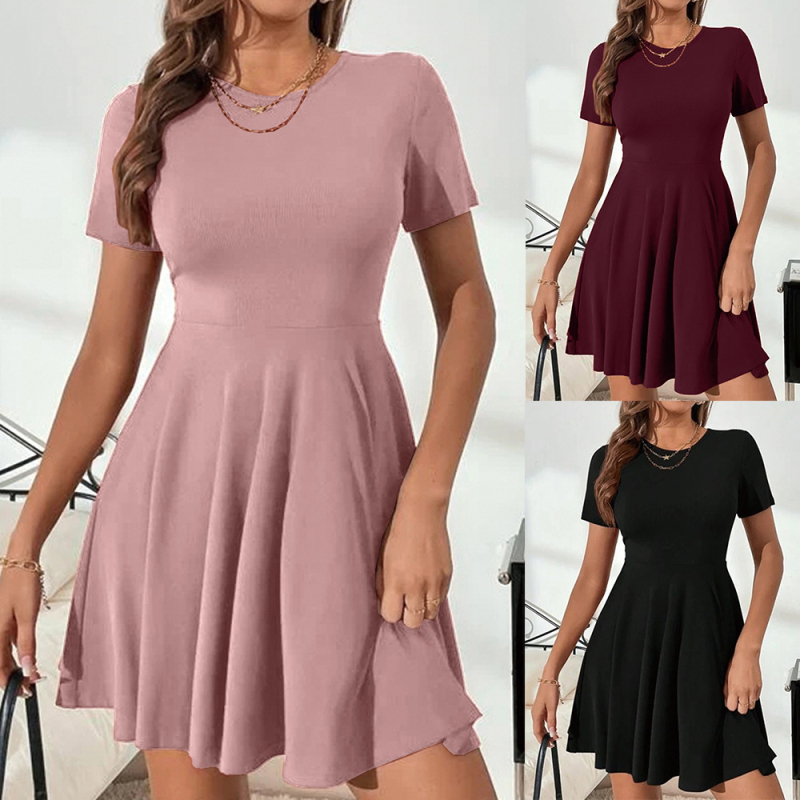 Φόρεμα patchwork με στρογγυλό λαιμό, κοντά μανίκια, πολυεστέρας μονόχρωμο